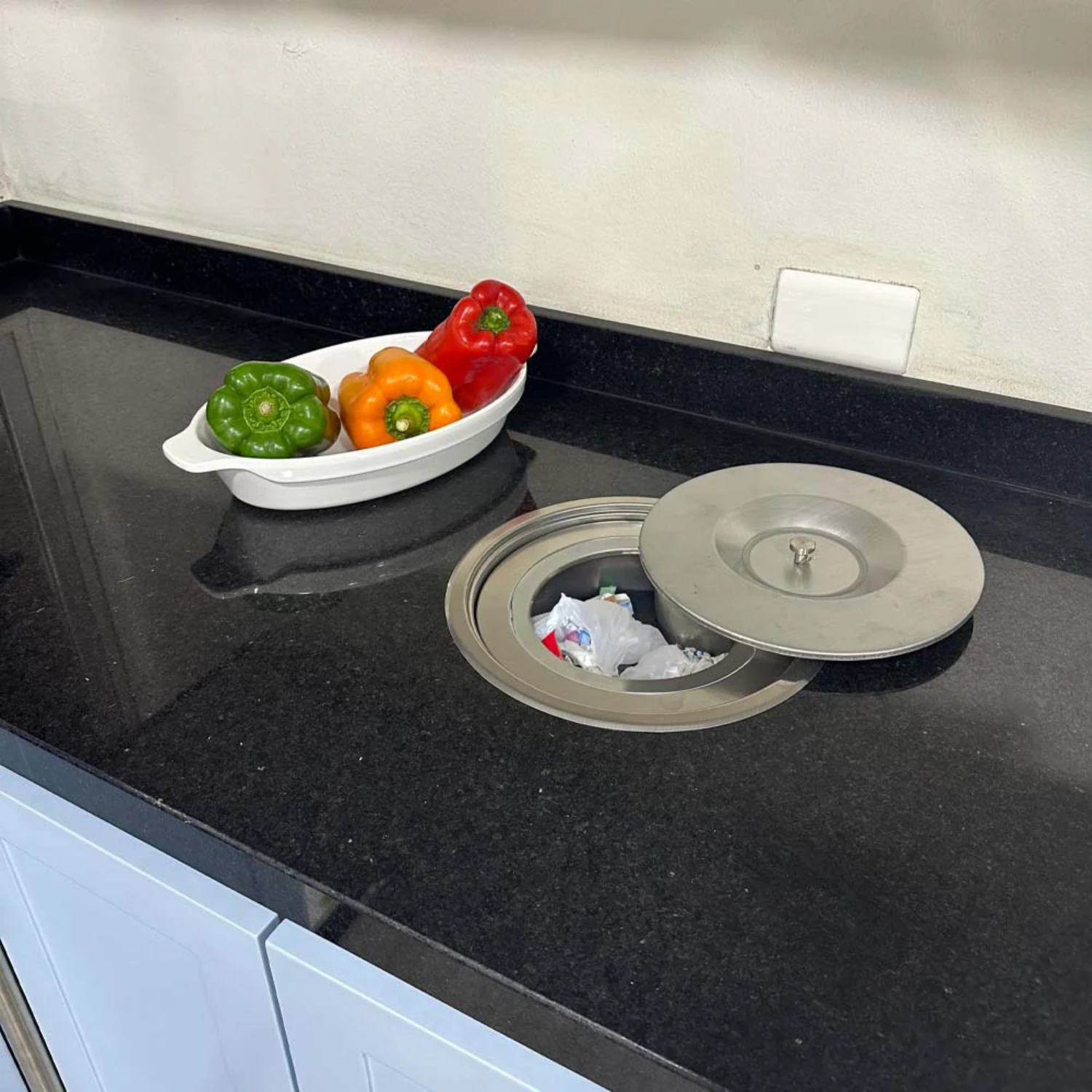 Optimiza tu espacio y mantén tu cocina siempre limpia con este basurero empotrado al mesón, ideal para cocinar y desechar residuos de manera rápida y eficiente.