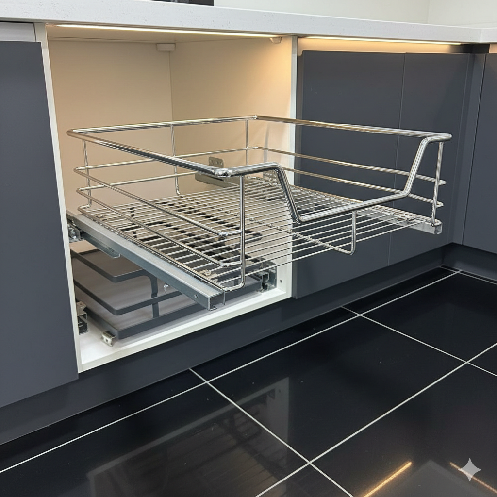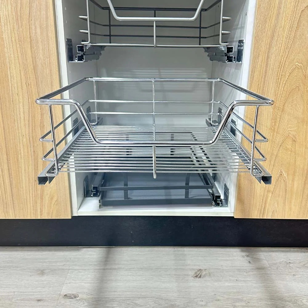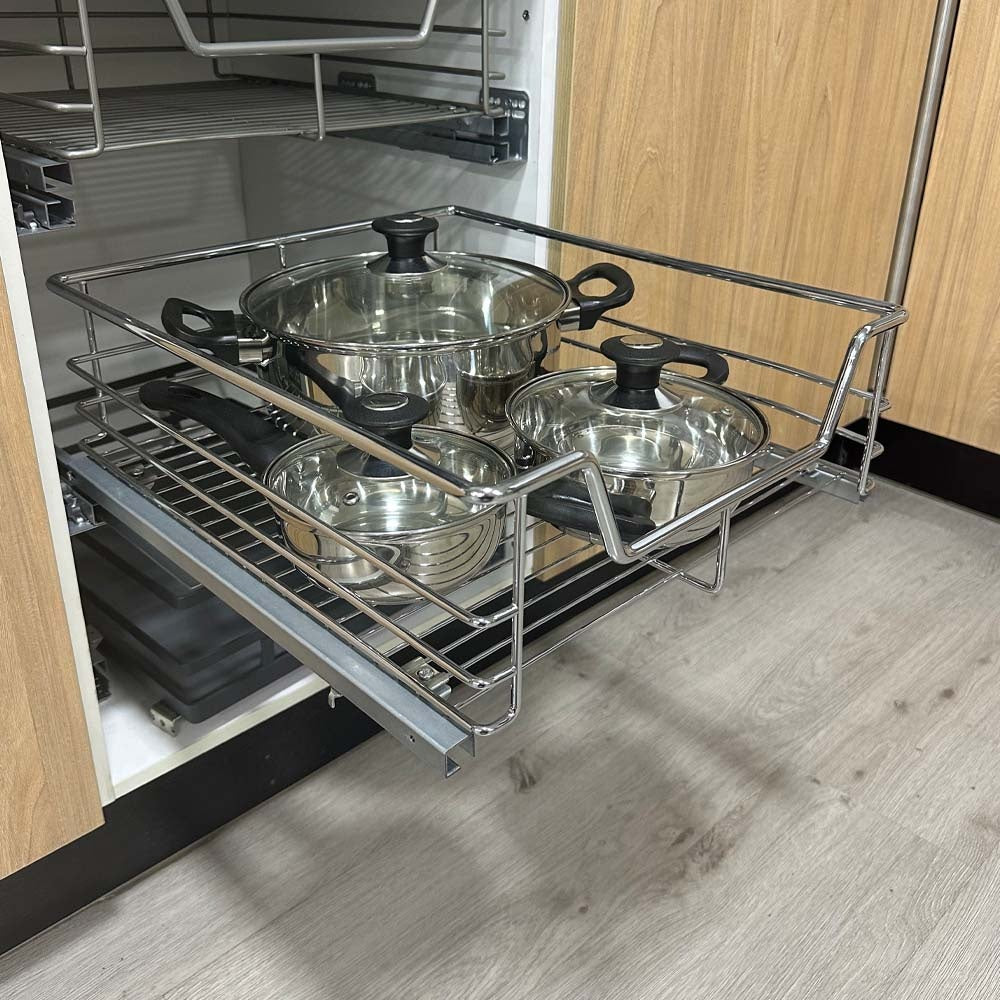 Mantén tus espacios siempre ordenados con esta cesta cromada extraíble, ideal para almacenar ollas, bowls, verduras, frutas u otros artículos tanto en la cocina como en la loggia u otros espacios del hogar. Su diseño versátil y funcional permite un acceso rápido y cómodo gracias a su sistema de extracción total con cierre suave.