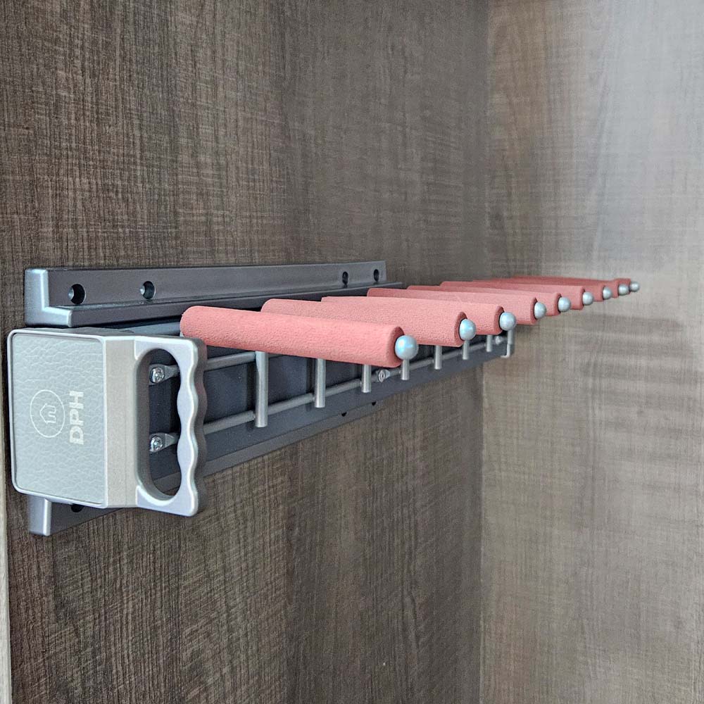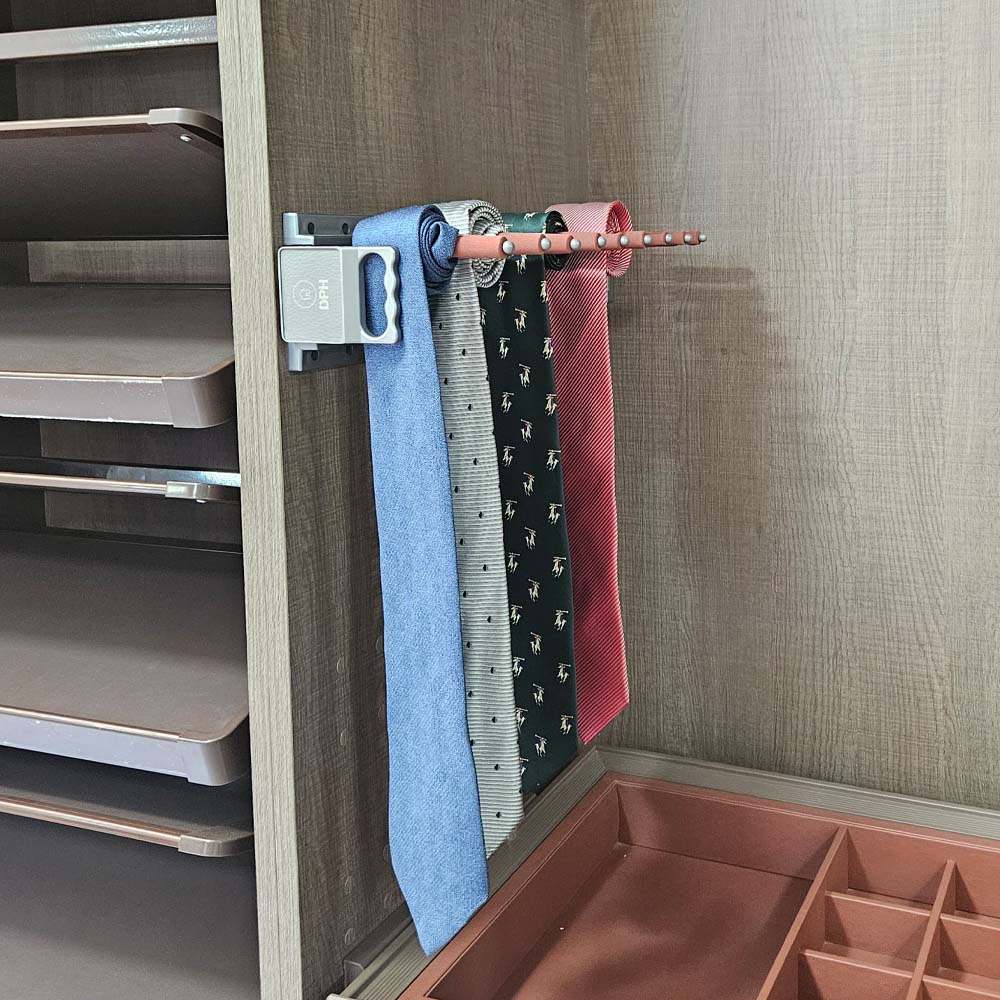 Transforma tu closet en un espacio de orden y estilo con nuestro organizador de corbatas y cinturones. Sus 9 ganchos te ayudarán a mantener pañuelos y corbatas sin arrugas, cinturones o accesorios favoritos siempre en orden y listos para usar. Está diseñado para encajar a la izquierda del closet y cuenta con cierre suave.