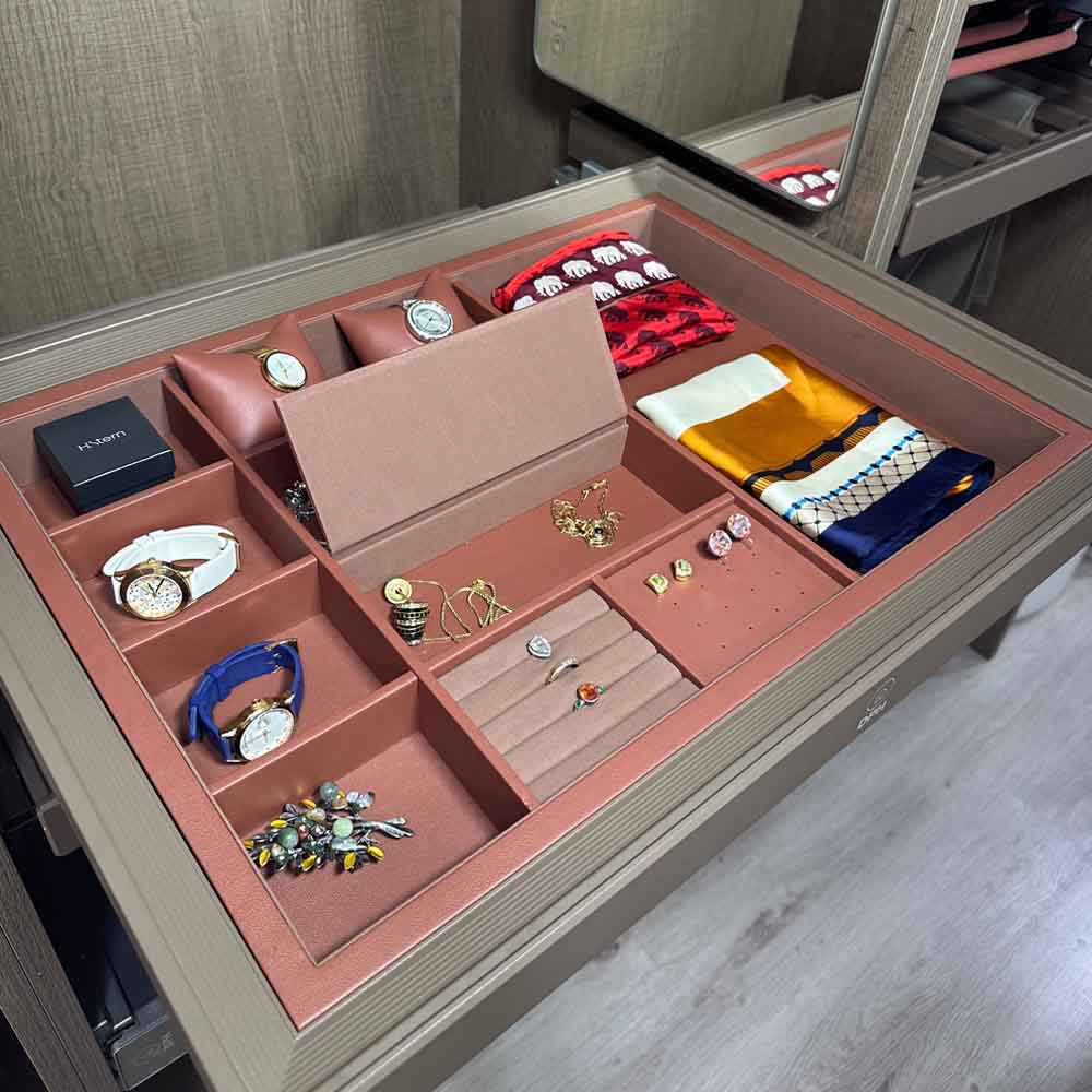 - Todo a la vista: permite ordenar relojes, anillos, aros, colgantes, pañuelos y más, facilitando la elección de tus accesorios cada día.
