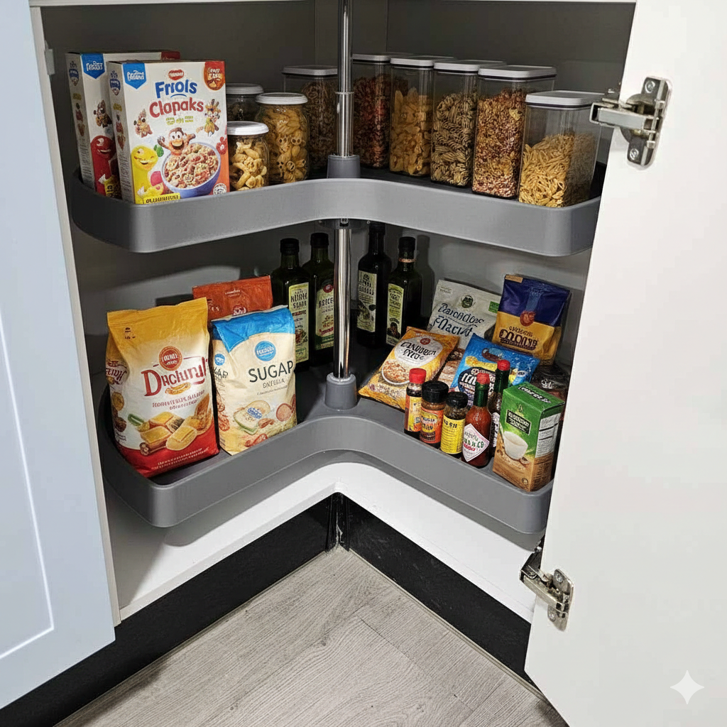 Aprovecha al máximo los rincones de tu cocina con esta rotonda esquinera 270°, una solución inteligente de almacenamiento diseñada para muebles esquineros. Con eje central ajustable en altura y dos bandejas giratorias de plástico en color gris, este accesorio permite acceder fácilmente a los espacios más difíciles.