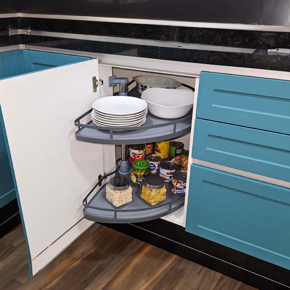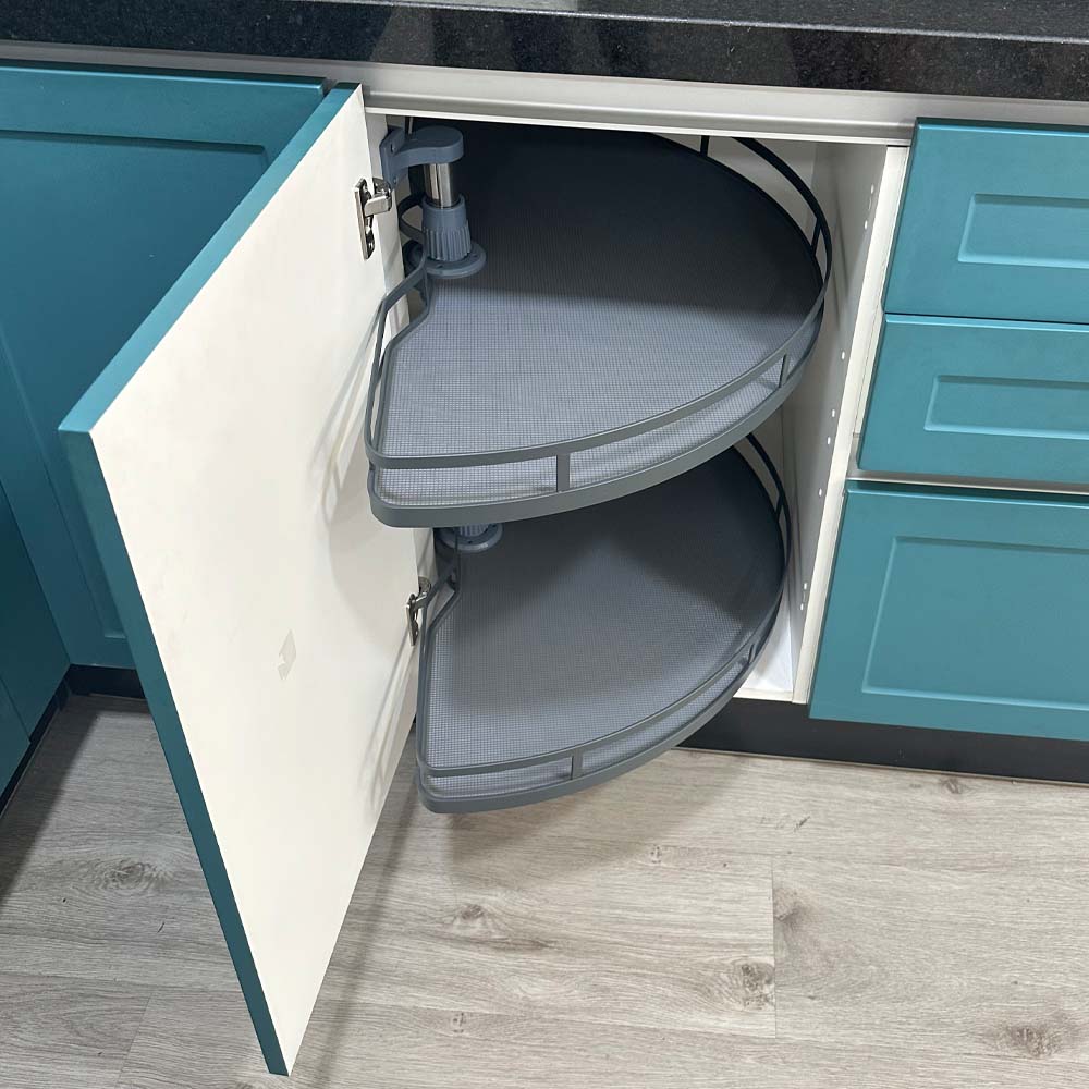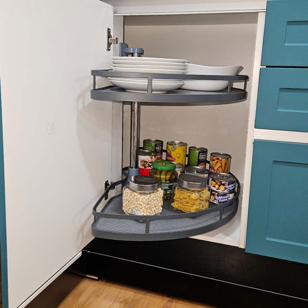 Aprovecha al máximo los rincones de tu cocina con esta rotonda esquinera, una solución inteligente de almacenamiento diseñada para muebles esquineros. Diseñada como una media luna, cuenta con eje central ajustable en altura y dos bandejas que giran 180°, este accesorio permite acceder fácilmente a los espacios más difíciles.